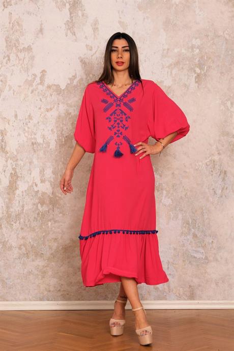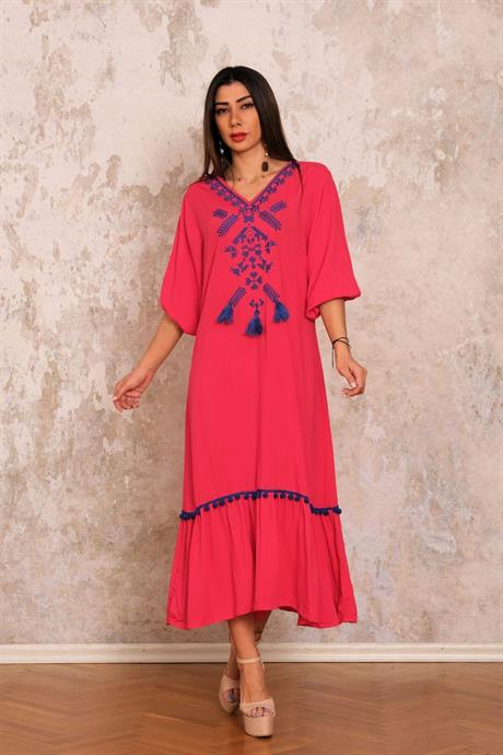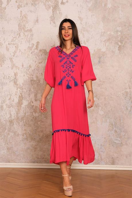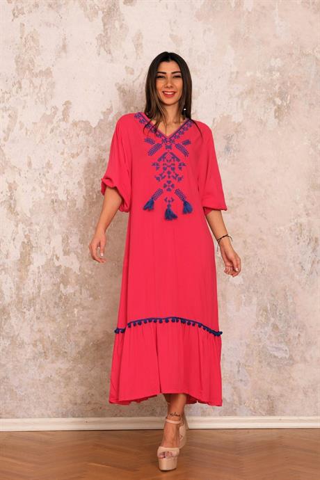 Длинное платье Markano фуксия с V-образным вырезом, вышивкой, кисточками и оборками, длинные рукава с резинкой