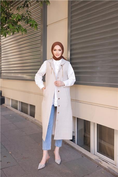 Длинный безрукавный жилет с капюшоном, застежкой и карманами, бежевый, размеры 38-46, модель от Bwest