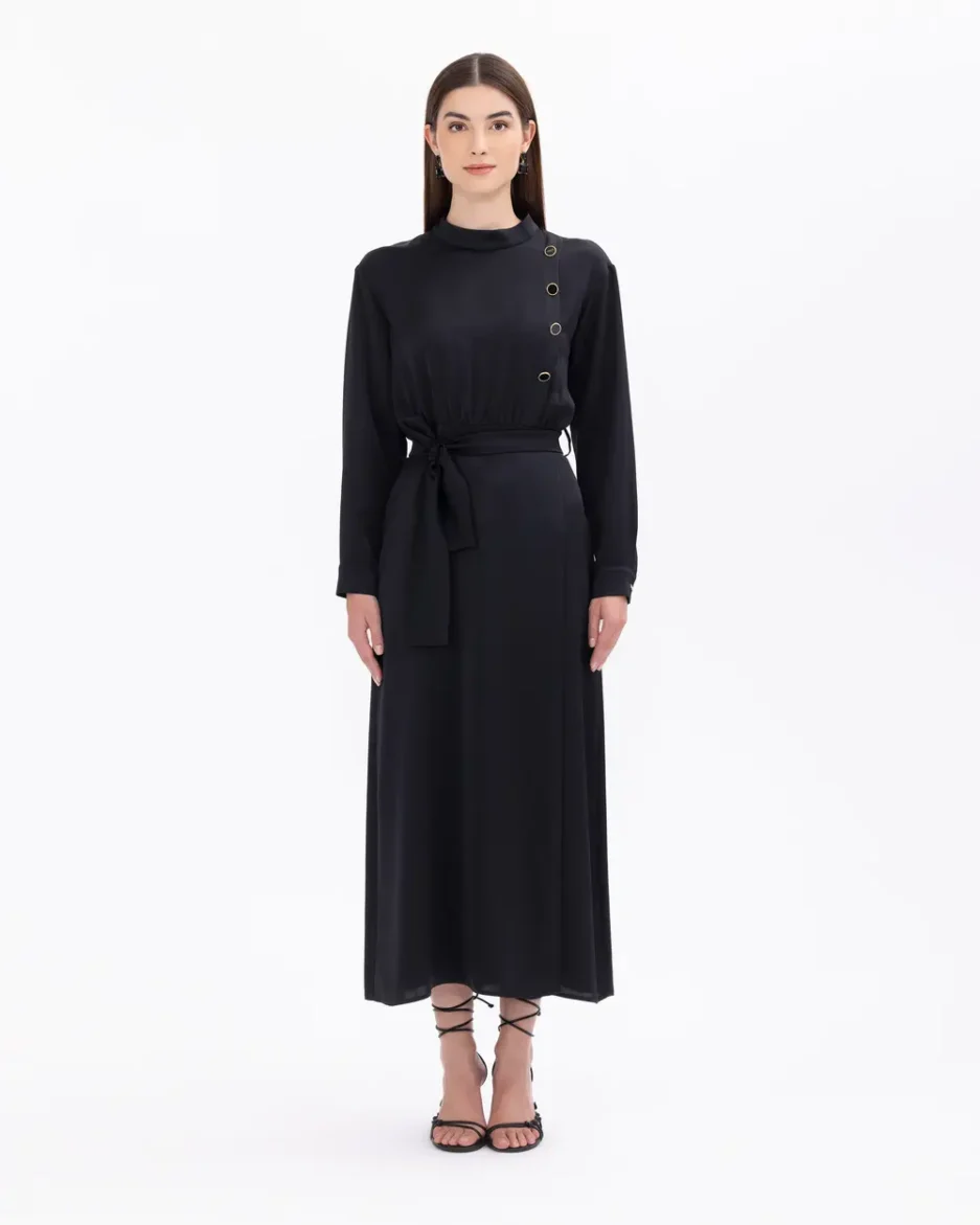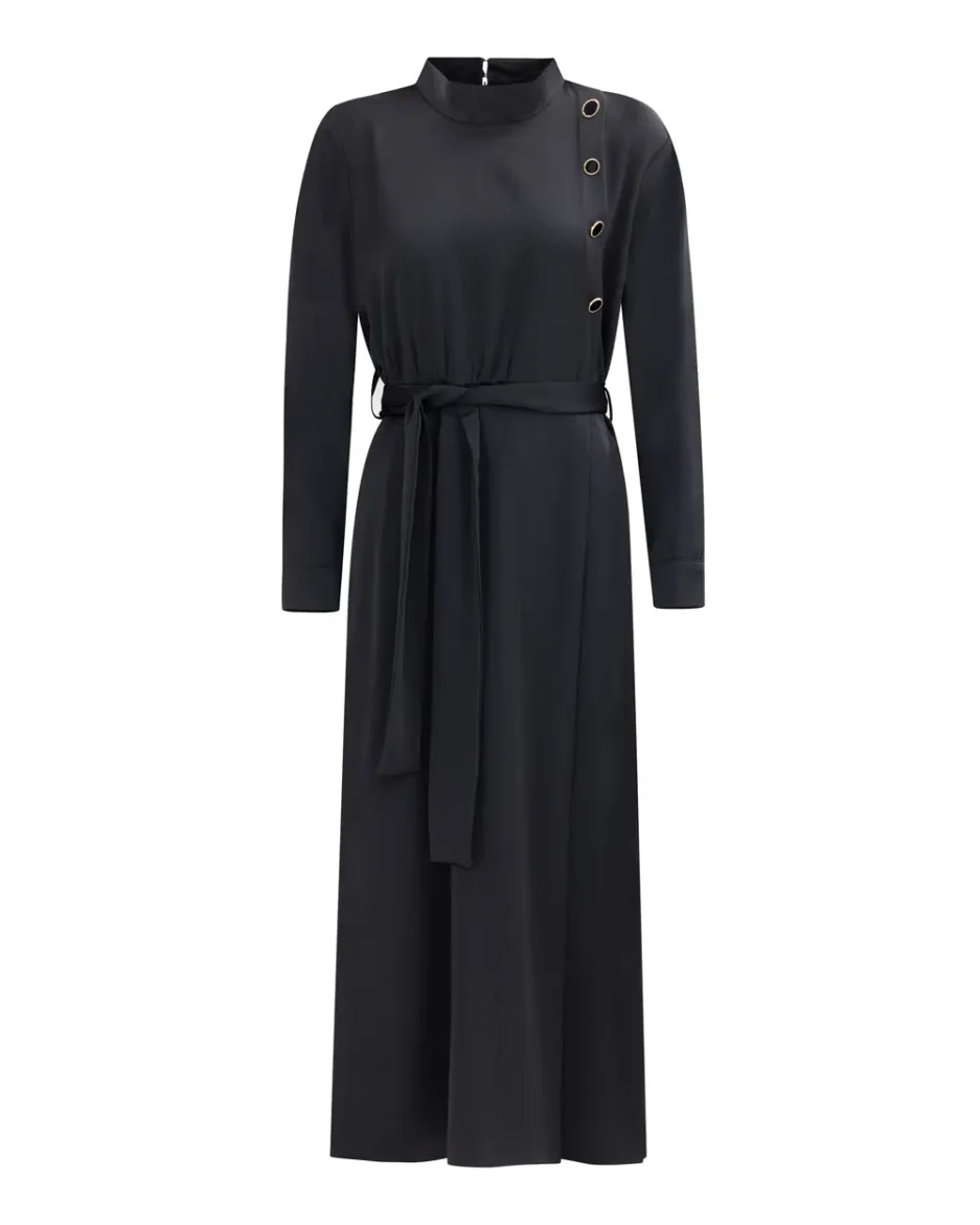 Элегантное платье с высоким воротником и пуговицами, полный рост, черное, удобный крой, турецкое качество, идеальное для любых мероприятий