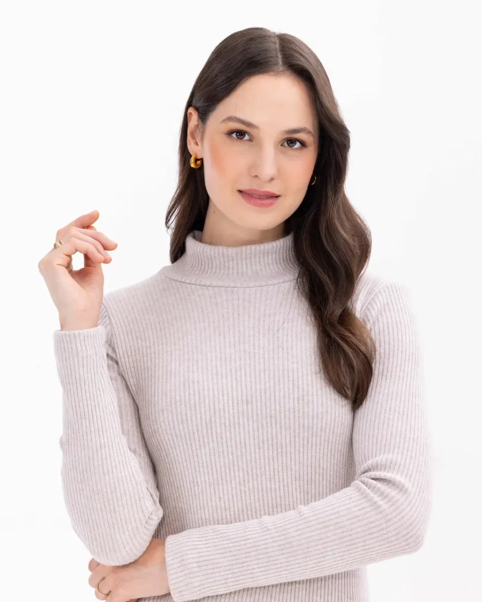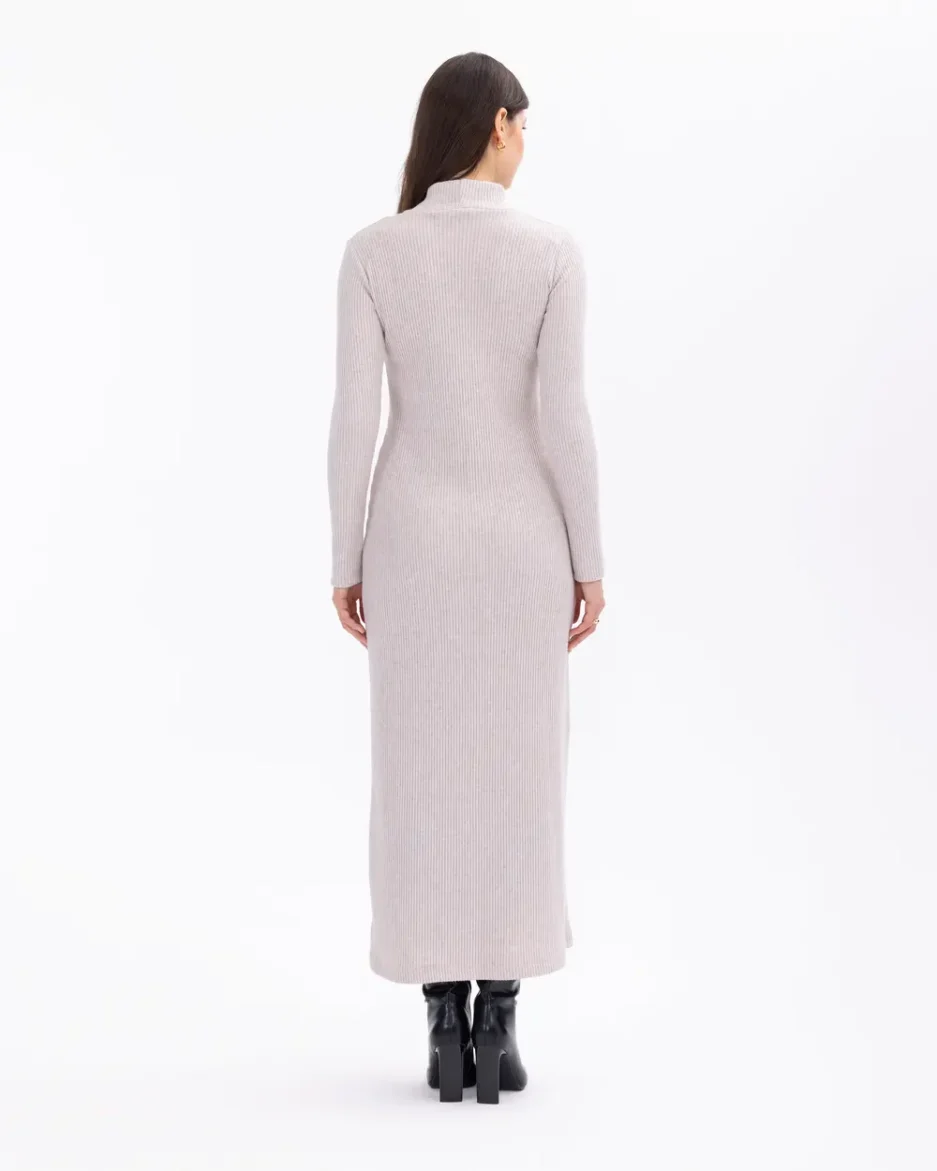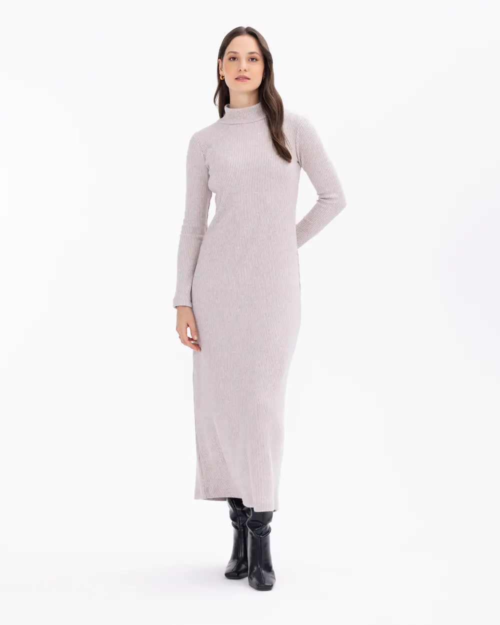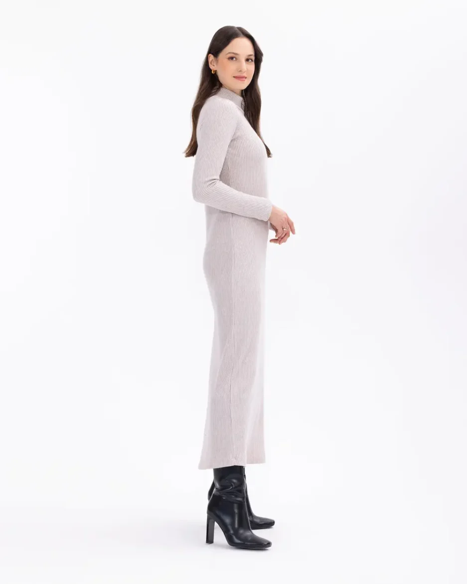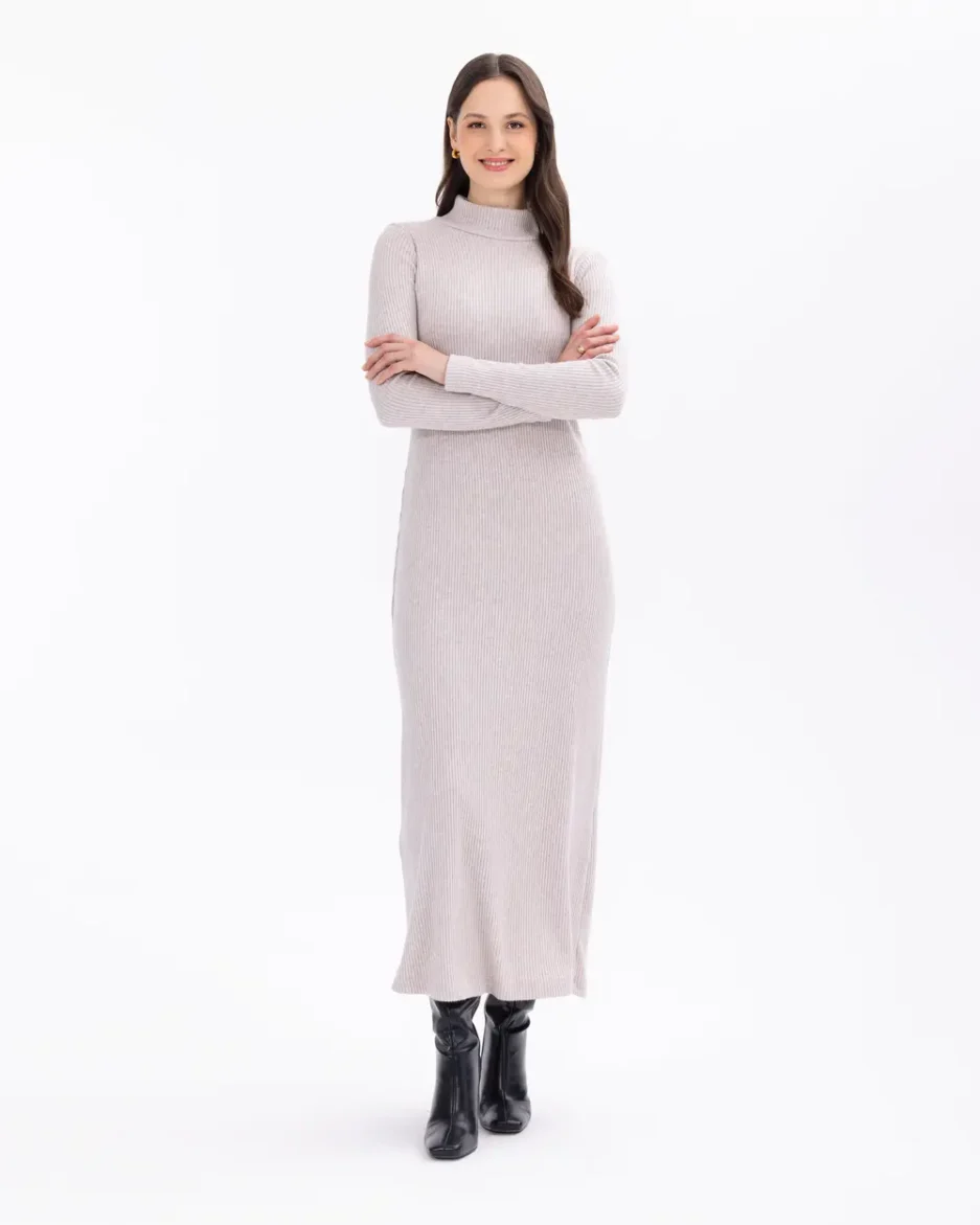 Элегантное трикотажное платье миди с полуворотником и облегающим силуэтом, доступное в бежевом, черном и сером цветах, идеально подходит для любого случая