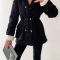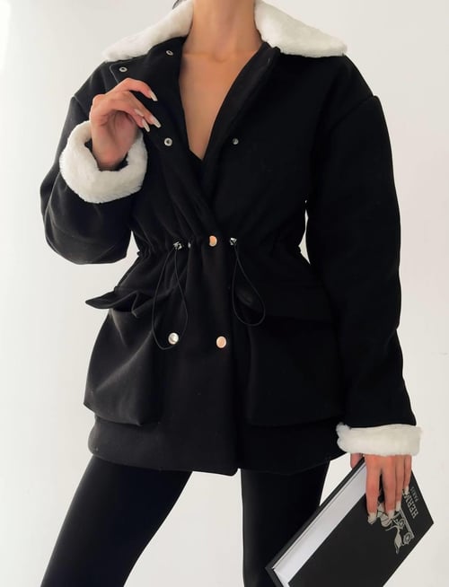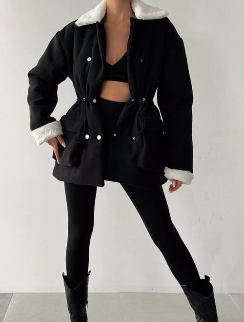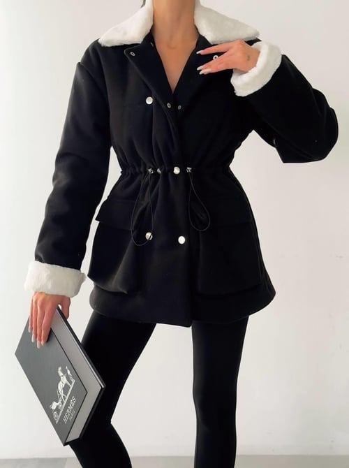 Кашемировое черное пальто с меховыми манжетами и эластичным поясом, длина 60 см, идеальная посадка, доступны размеры S и M