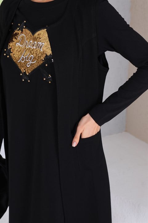 Комплект из 2-х частей: жилет и туника – Черный, длина жилета 110 см, туники 90 см, подходит для хиджаба, нормальный крой, размеры S, M, L, XL, XXL
