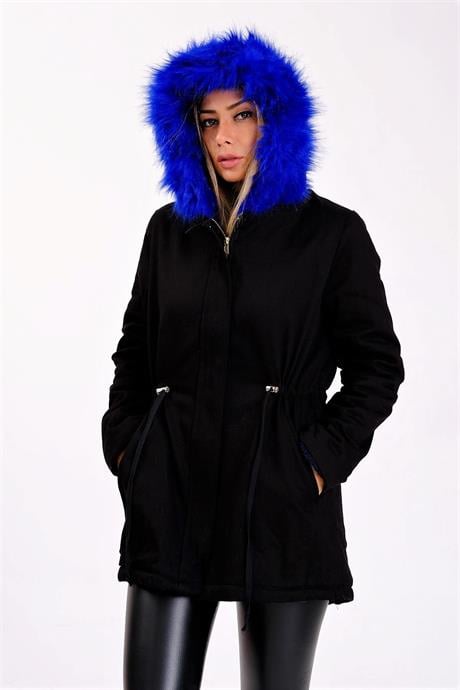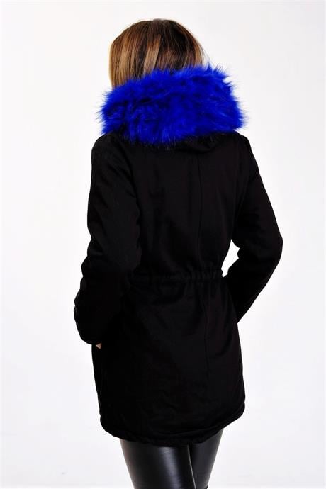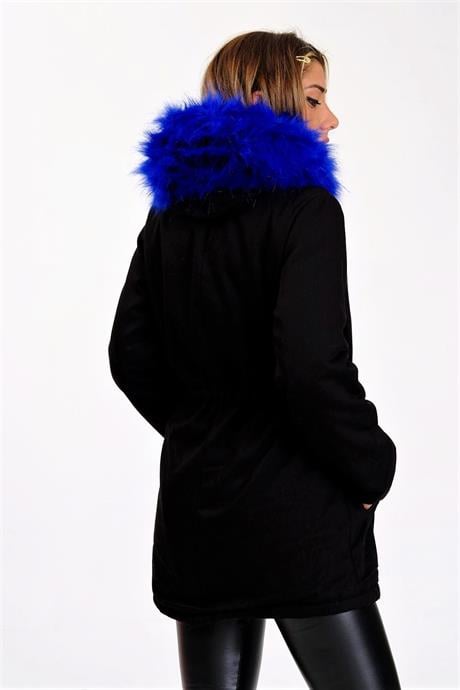 Куртка Markano черная с капюшоном и синим мехом, утепленный габардин, доступные размеры 36-42