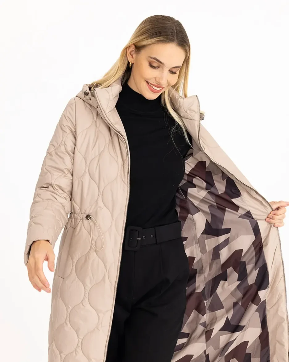 Куртка с завязками на талии, водоотталкивающая, с капюшоном, стеганая, длиной ниже колена Бежевая