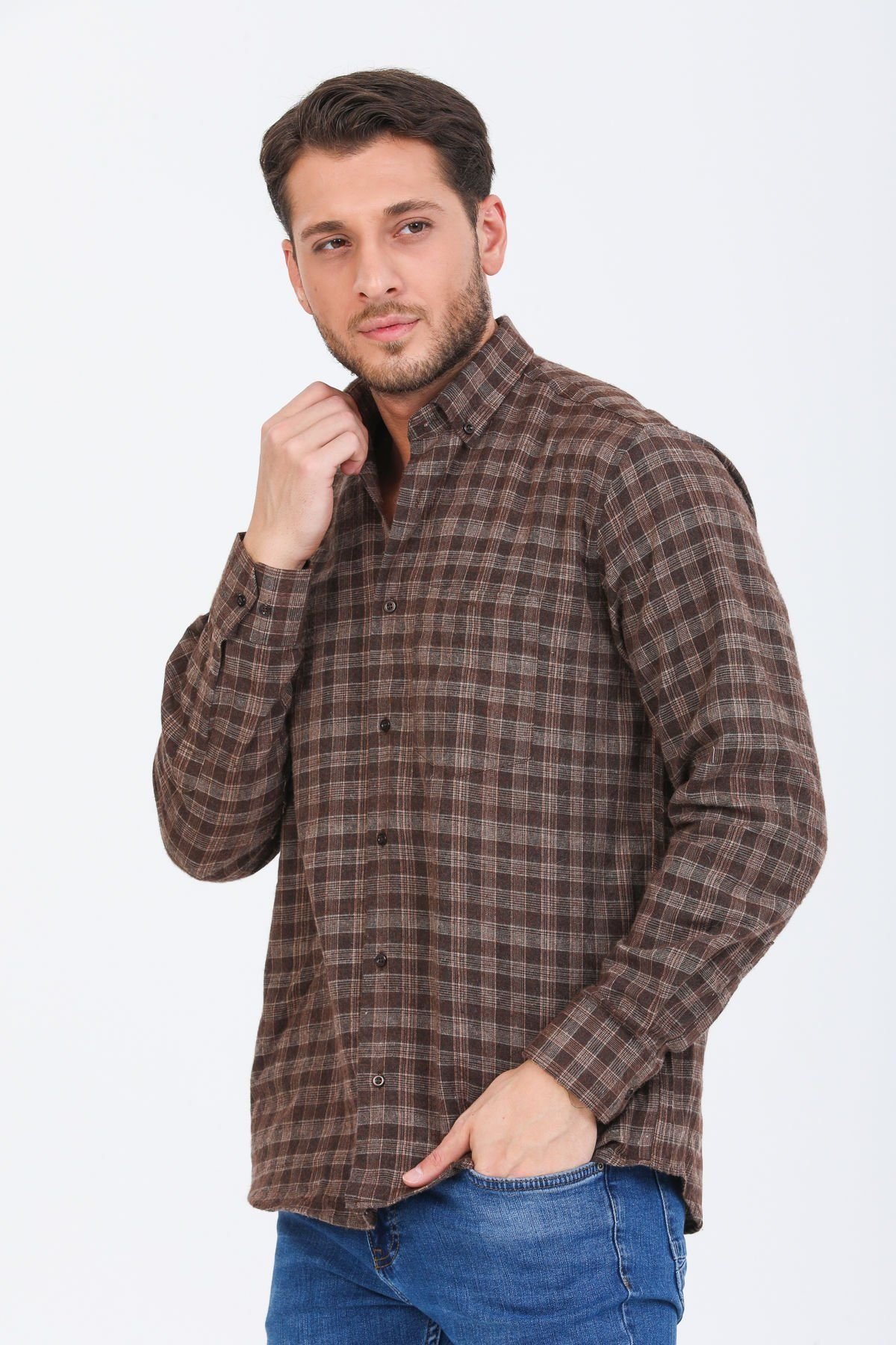 Мужская коричневая зимняя рубашка с длинным рукавом, клетчатым воротником и кнопками, свободный крой, турецкое производство