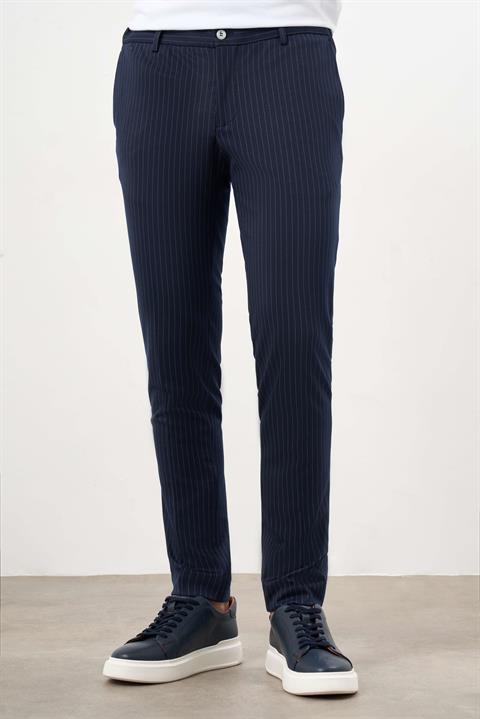 Мужские темно-синие брюки с лампасами slim fit из поливискозы с боковыми карманами