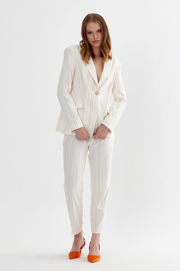 Панталоны с оранжевыми полосками и поясом, состав: 64% ПЭ, 33% вискоза, 3% ЭА, длина 95 см, размер 36-42