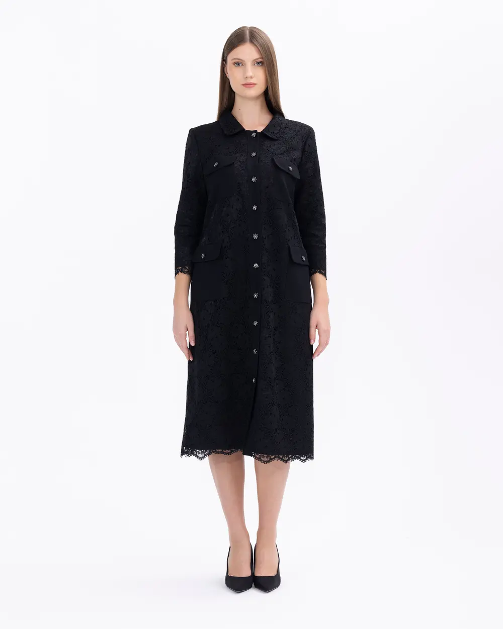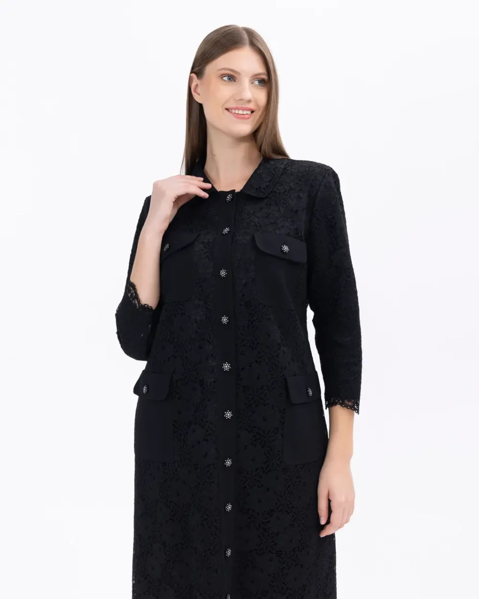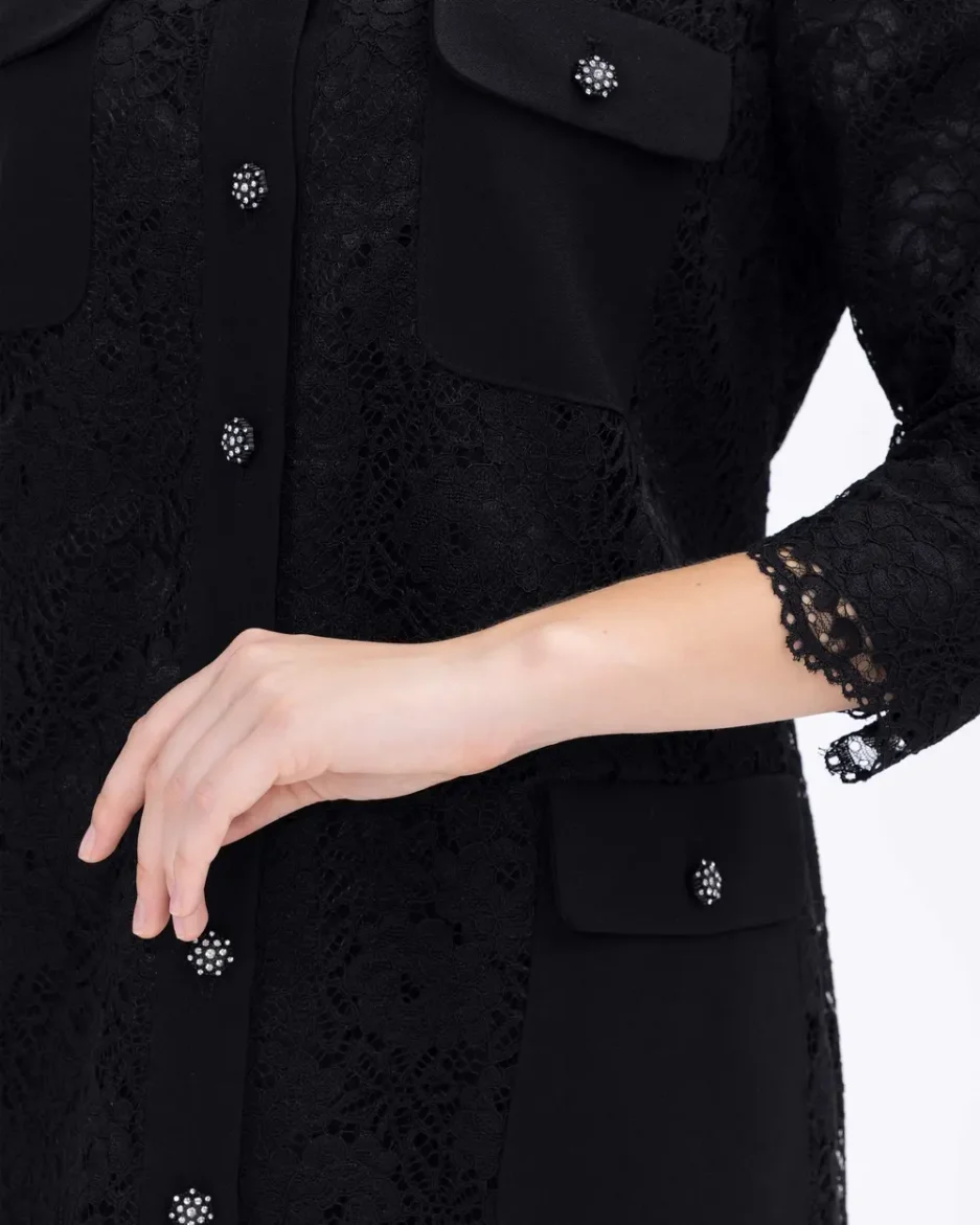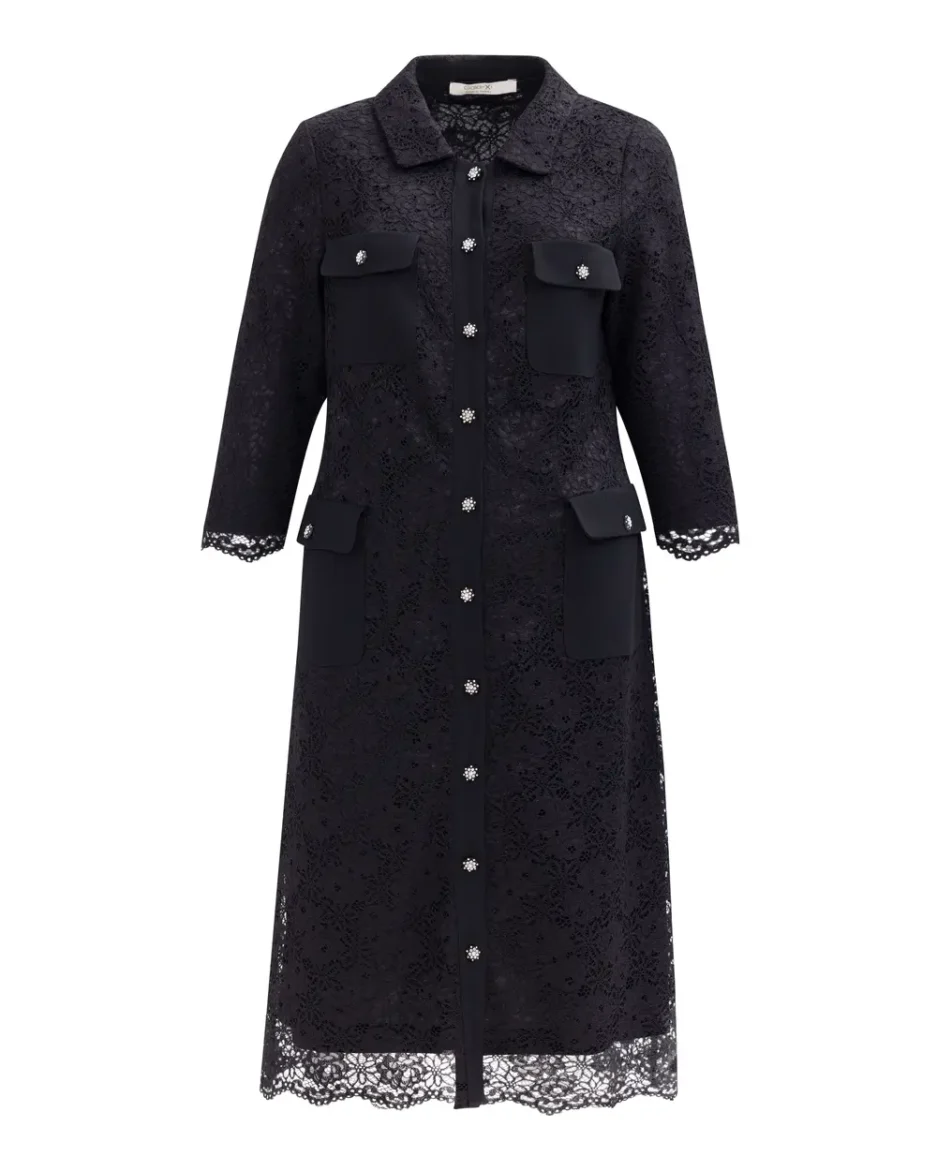 Платье большого размера с карманами и пуговицами, кружевные детали, миди длина, комфортный фасон, двойные карманы, идеальное для особых случаев