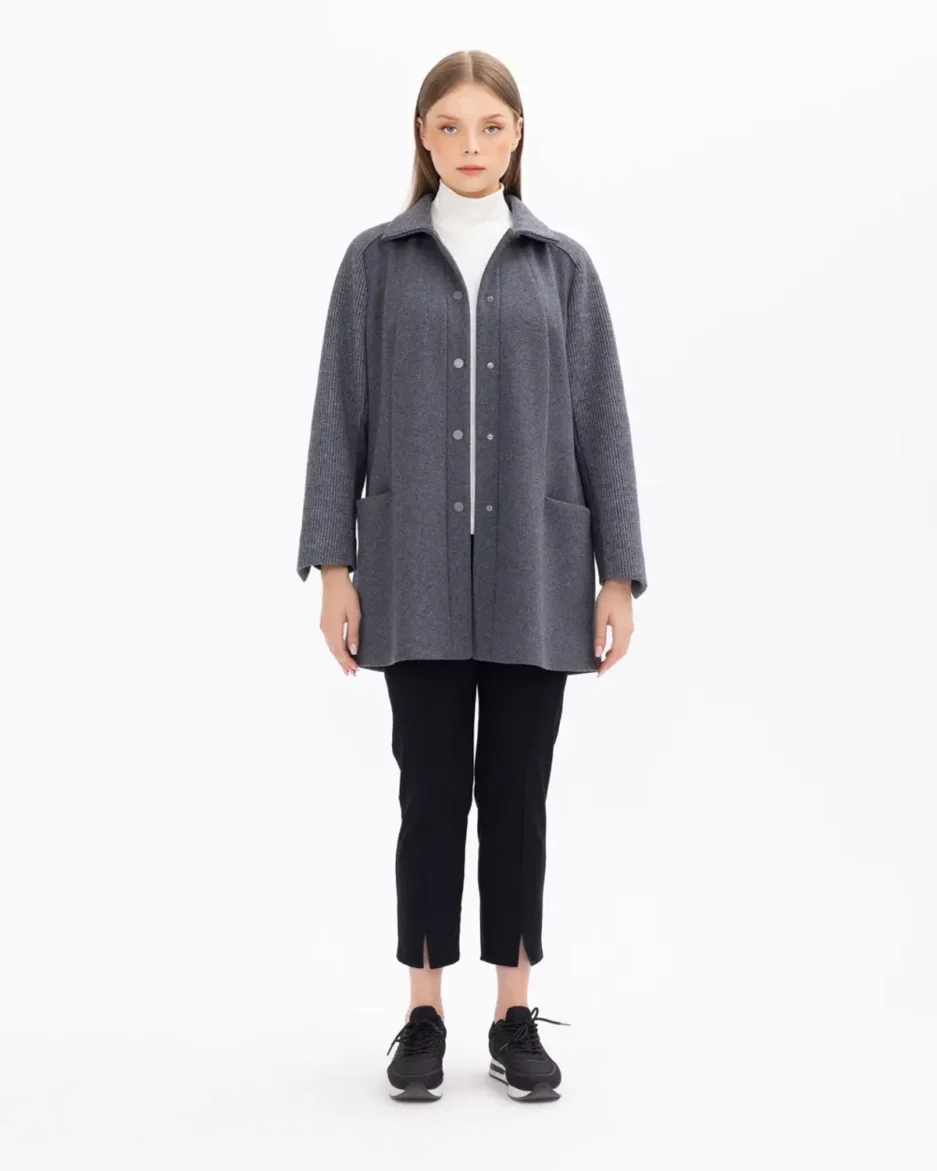 Плюс размер пальто с карманами и трикотажными рукавами без подкладки(серое)
