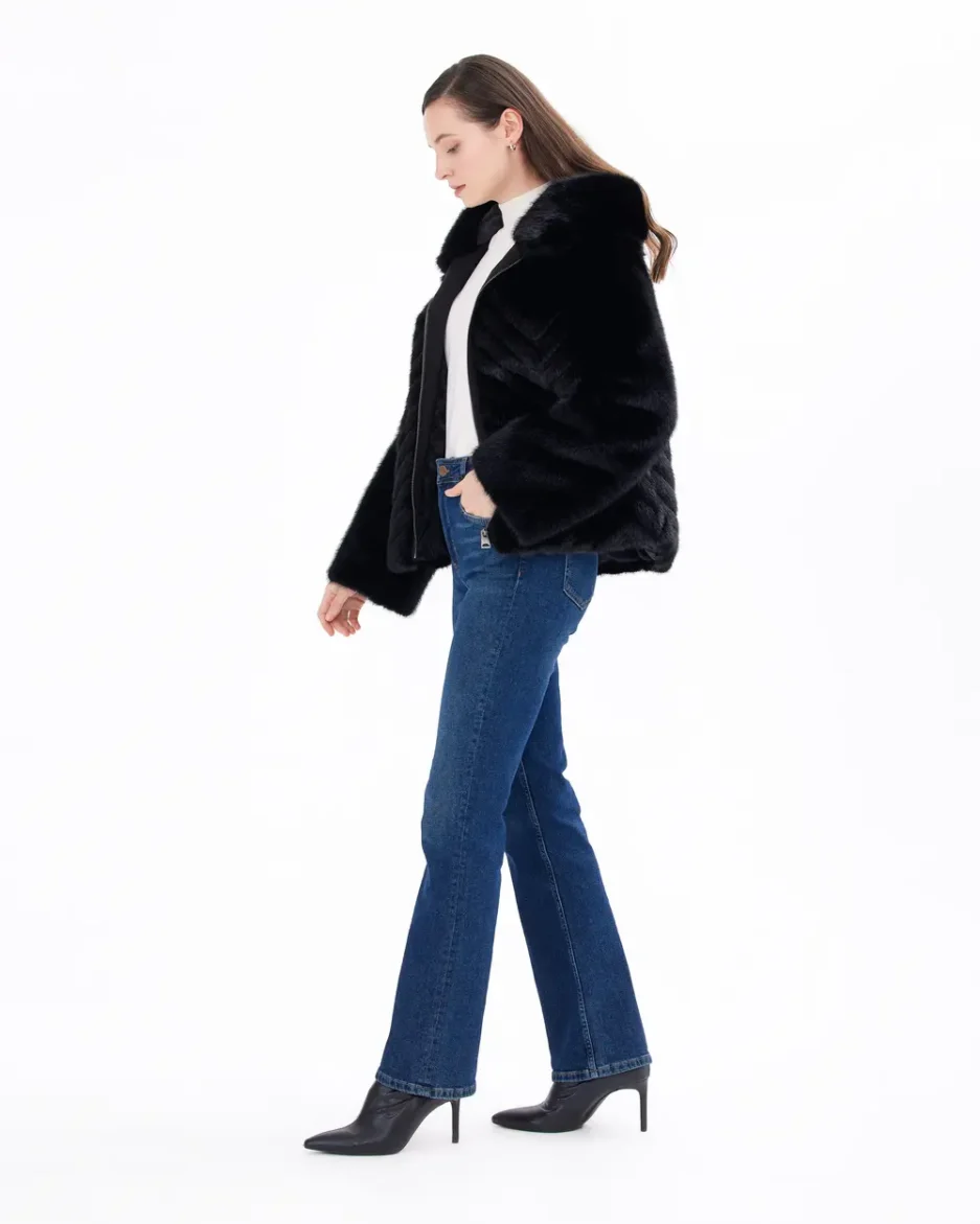 Пуховик с капюшоном и молнией из мягкого флиса, тёплый и стильный, длина по пояс, насыщенный черный цвет, комфортный крой