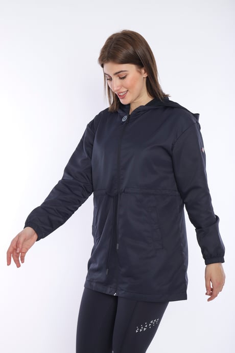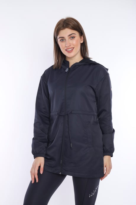 Спортивная ветровка Escetic для женщин, темно-синяя с капюшоном, 2 кармана, водоотталкивающая, легкая, дышащая, 100% полиэстер, стильный силуэт