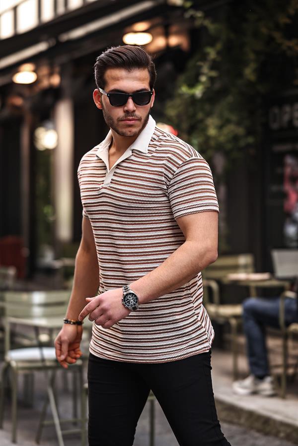 Трикотажный свитер V-образным вырезом с полосками в коричневом цвете, современные стильные детали для повседневного использования
